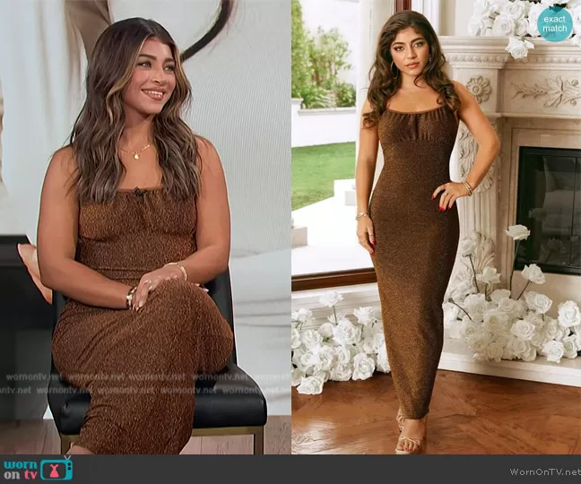 on E! News on E! was spotted wearing this gold metallic dress on E! News on Dec 18 2023's episode. 's Dress is the X GiudiceGirlsGlitter Cami Bodycon Dress by Shein.