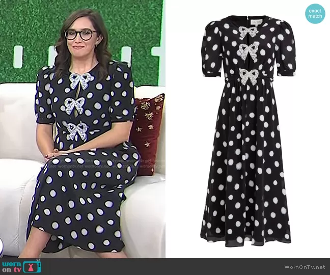 Savannah Sellers on Today on NBC was spotted wearing this black bow embellished polka dot dress on Today on Jul 18 2024's episode. Savannah S's Dress is the Jamie Dress in Mono Polka Dot by Saloni . Savannah S's Shoes is the Brushed Leather Slingback Pumps by Prada.