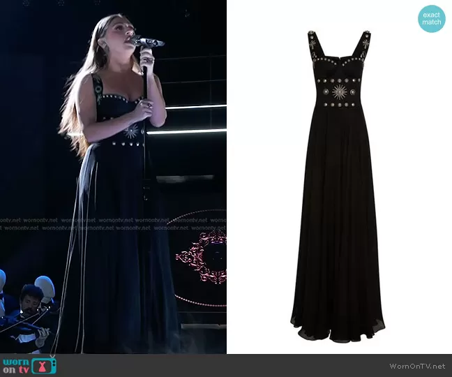 on The Voice on NBC was spotted wearing this black studded maxi dress on The Voice on Dec 12 2023's episode. 's Dress is the Embellished Silk Satin Dress by Fausto Puglisi.