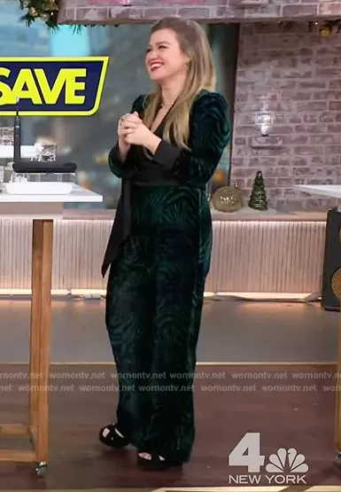 Kelly Clarkson on The Kelly Clarkson Show on NBC was spotted wearing this green animal print velvet jumpsuit on The Kelly Clarkson Show on Dec 19 2023's episode. Kelly's Jumpsuit is the Vegas Tiger Print Long Sleeve Velvet Jumpsuit by Diane von Furstenberg.