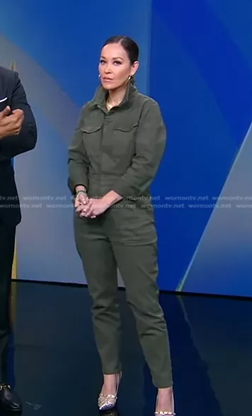 Eva Pilgrim on Good Morning America on ABC was spotted wearing this army green jumpsuit on Good Morning America on Dec 19 2023's episode. Eva's Jumpsuit is the Fit For Success Jumpsuit in Fern by Good American.