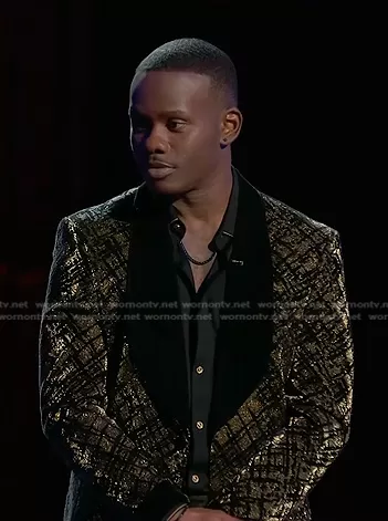 on The Voice on NBC was spotted wearing this metallic plaid velvet blazer on The Voice on Dec 13 2023's episode.