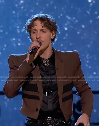 on The Voice on NBC was spotted wearing this brown cropped blazer on The Voice on Dec 13 2023's episode. 's Jacket is the Slim Fit Cropped Pagoda Shoulder Blazer in brown by Asos .