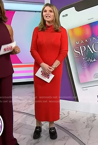 Jenna Bush Hager on Today on NBC was spotted wearing this red knit long sleeve dress on Today on Dec 19 2023's episode. Jenna's Dress is the Mock Neck Rib Sweater Sheath Dress by Lela Rose . Jenna's Shoes is the Wynter Lug Sole Mule by Veronica Beard.