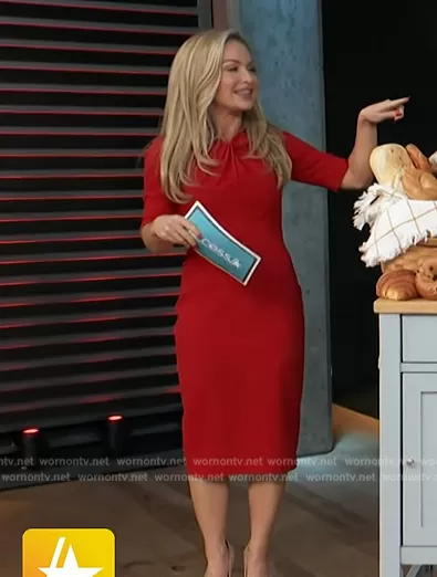 on Access Hollywood on NBC was spotted wearing this red twist neck dress on Access Hollywood on Dec 20 2023's episode. 's Dress is the Caterina Knotted Dress by L.K. Bennett.