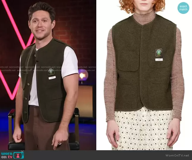 Niall Horan on The Voice on NBC was spotted wearing this logo patch vest on The Voice on Dec 17 2023's episode. Niall's Vest is the Walker Vest in Khaki by Rier . Niall's Shoes is the Chuck 70 Hi Sneakers in Khaki by Converse.