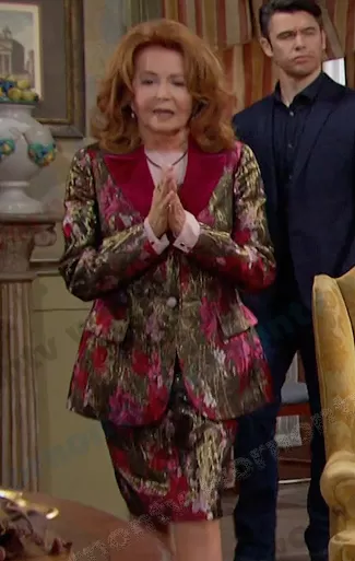 Maggie Horton (played by Suzanne Rogers) on Days of our Lives on Peacock was spotted wearing this metallic floral blazer and skirt on Days of our Lives on Dec 20 2023's episode. Maggie's Jacket is the Floral Jacquard & Velvet Blazer by Teri Jon by Rickie Freeman . Maggie's Skirt is the Floral Jacquard Knee-Length Skirt by Teri Jon by Rickie Freeman.