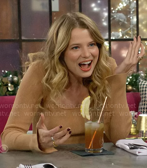 Summer from Y&R showcases her knack for choosing effortlessly chic attire with the Manuela sweater in caramel by Paola Bernardi. This simple yet sophisticated top features a flattering square neckline, a detail that lends a modern edge to the classic rib knit fabric. The camel color of the sweater adds a touch of warmth and versatility, making it a perfect match for a variety of looks. What sets this piece apart are the split cuffs, a subtle yet striking addition that gives the sweater a unique flair. This design element not only adds visual interest but also demonstrates Summer's ability to pick out garments that blend timeless style with contemporary touches. The Manuela sweater is more than just a piece of clothing; it's a reflection of Summer's character - understated, stylish, and always on-trend.