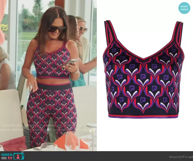 Lisa Barlow on The Real Housewives of Salt Lake City on Bravo was spotted wearing this purple printed crop top and pants on The Real Housewives of Salt Lake City on episode 'Swimming With the Fishes' (4x15) in Dec 2023. Lisa's Top is the Monogram intarsia-knit crop top by Rabanne . Lisa's Pants is the Jacquard-knit straight-leg pants by Rabanne.
