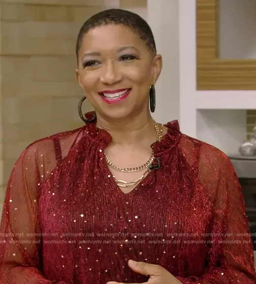 Deja Vu on Live with Kelly and Mark on Disney ABC Home Entertainment was spotted wearing this red v-neck metallic dress on Live with Kelly and Mark on Dec 21 2023's episode. Deja Vu's Dress is the Metallic Puff-Sleeve Ruffled Dress by Vince Camuto.