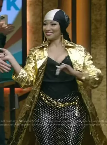on Live with Kelly and Mark on Disney ABC Home Entertainment was spotted wearing this gold metallic coat on Live with Kelly and Mark on Dec 20 2023's episode. 's Top is the Sunday off-the-shoulder satin corset top by Vivienne Westwood . 's Coat is the Crinkled Metallic Trench Coat with Belt by Dolce & Gabbana . 's Shoes is the Trompe-L'Ceil Mules by Schiaparelli.