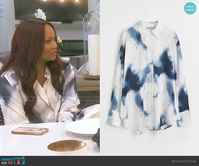 Garcelle Beauvais on The Real Housewives of Beverly Hills on Bravo was spotted wearing this white and blue tie dye shirt and pants on The Real Housewives of Beverly Hills on episode 'A Feisty Fiesta' (13x09) in Dec 2023. Garcelle's Top is the Shirt with a Sheen in white by H&M . Garcelle's Pants is the Wide-Cut Pants in white by H&M.