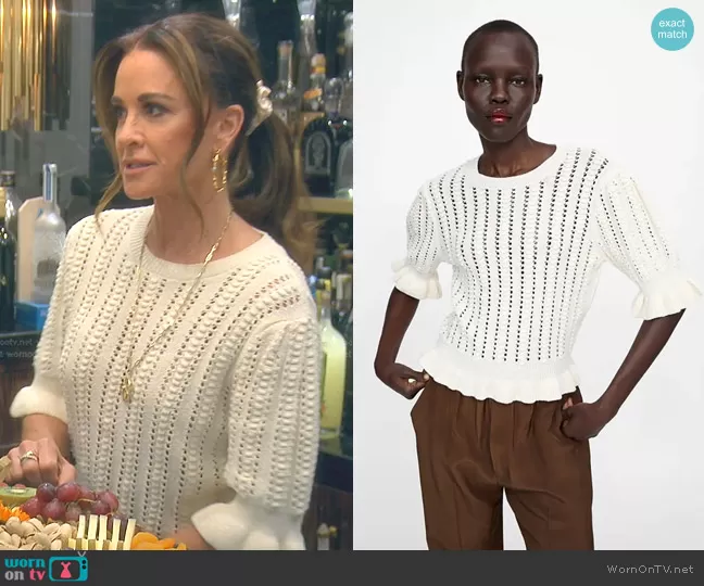 Kyle Richards on The Real Housewives of Beverly Hills on Bravo was spotted wearing this white ruffle sleeve sweater on The Real Housewives of Beverly Hills on episode 'A Feisty Fiesta' (13x09) in Dec 2023. Kyle's Top is the Textured Top by Zara . Kyle's Necklace is the Custom Four Heart Clover Oversized Medallion by Foundrae.