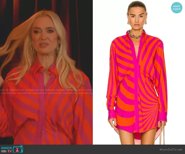 Erika Jayne on The Real Housewives of Beverly Hills on Bravo was spotted wearing this pink and orange striped shirtdress on The Real Housewives of Beverly Hills on episode 'A Feisty Fiesta' (13x09) in Dec 2023. Erika's Dress is the The Nouveau Mini Shirt Dress by Brandon Maxwell.