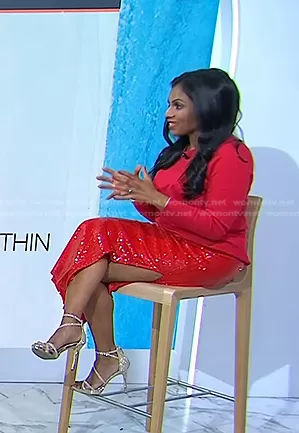 on Today on NBC was spotted wearing this red sequin skirt on Today on Dec 20 2023's episode. 's Skirt is the Collection Sequin Side-Slit Midi Skirt by J. Crew.