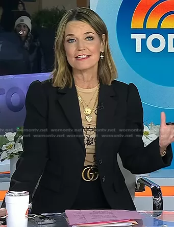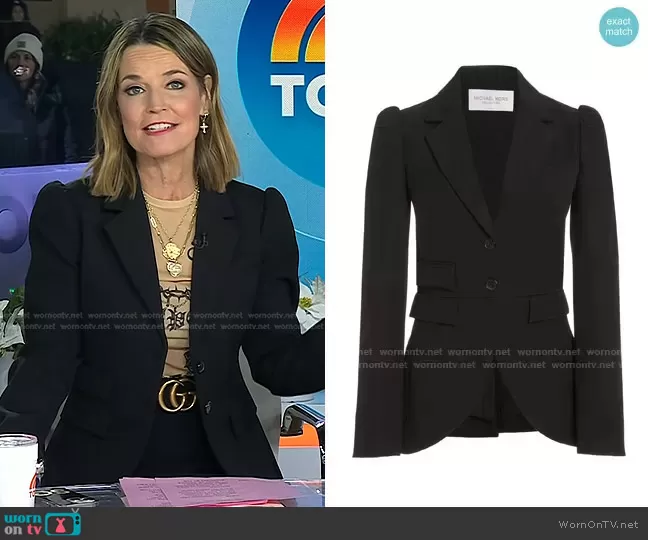 Savannah Guthrie on Today on NBC was spotted wearing this black puff sleeve blazer and Skirt on Today on Dec 21 2023's episode. Savannah's Jacket is the Puffed-Sleeve Gabardine Blazer by Michael Kors . Savannah's Skirt is the Double G Wool & Silk Crepe A-Line Skirt by Gucci.