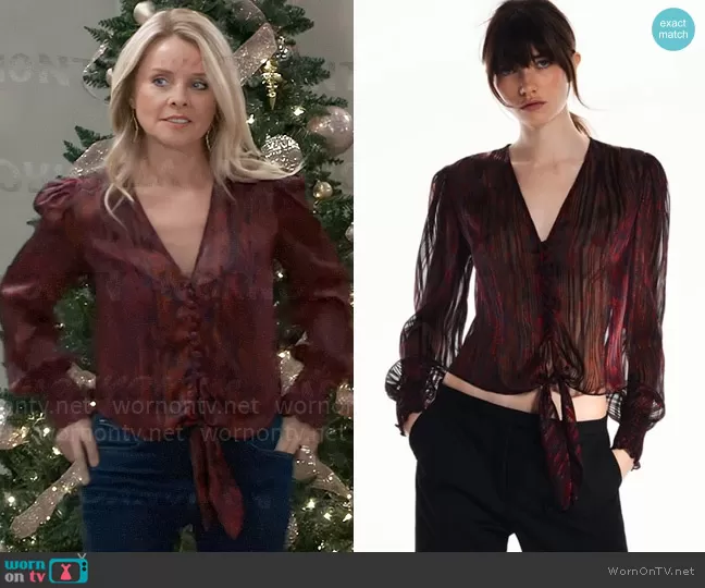 Felicia's red and black floral tie waist blouse from Zara on GH is a perfect blend of delicate femininity and bold style statements. The top features a flattering v-neck and an adorable tie at the front base of the hem, adding a touch of whimsy to the classic floral pattern. Its long sleeves and slightly sheer fabric elevate the blouse, making it a versatile piece for both on-screen charm and real-world fashion. This blouse is not just a wardrobe choice; it's a narrative tool that adds depth to Felicia's character, combining practicality with a sense of elegance. The subtle interplay of red and black florals against the sheer background creates an ethereal yet grounded look, resonating with viewers who seek inspiration for their own fashion explorations. Felicia's choice reflects a growing trend in contemporary fashion where visual appeal meets comfort, making this blouse an emblem of modern sophistication in daytime television.