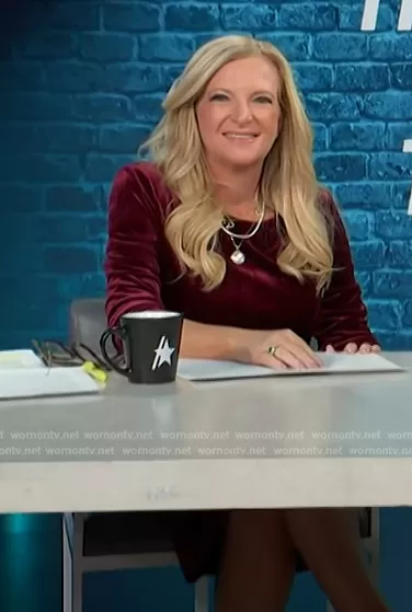 on Access Hollywood on NBC was spotted wearing this burgundy velvet dress on Access Hollywood on Dec 22 2023's episode. 's Dress is the Stretch Velvet Body-Con Dress by Adrianna Papell.