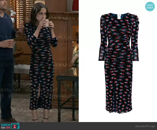 In a stunning display of fashion-forward elegance, Sam from GH has set a new standard for on-screen style with the Prinyanka dress in fortune rose dot print by Diane von Furstenberg. This captivating piece, a midi-length dress adorned with vibrant red and blue flowers against a sleek black backdrop, embodies a perfect blend of boldness and sophistication. With its figure-hugging silhouette, flattering three-quarter length sleeves, and a tasteful slit, this dress is more than just a costume—it's a statement. It’s a testament to the power of a well-chosen outfit to elevate a character's presence, seamlessly blending the lines between the character's persona and high fashion. This dress isn't just a choice; it's a narrative, telling a story of strength, femininity, and unapologetic style.