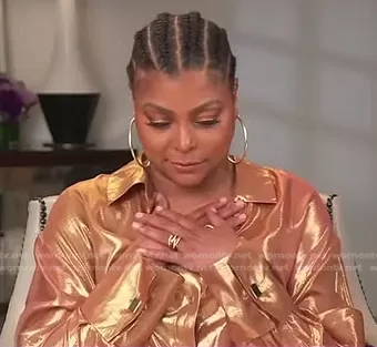 on Today on NBC was spotted wearing this metallic orange shirt on Today on Dec 22 2023's episode. 's Top is the Romy Metallic Silk Blend Button-Up Shirt in Nude Glitter by Retrofete.