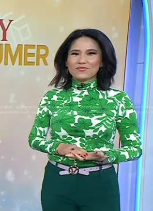 Vicky Nguyen on Today on NBC was spotted wearing this green floral turtleneck top on Today on Dec 22 2023's episode. Vicky's Top is the Matte Jersey Turtleneck in Botanical Print in Vintage Kelly by J. Crew.