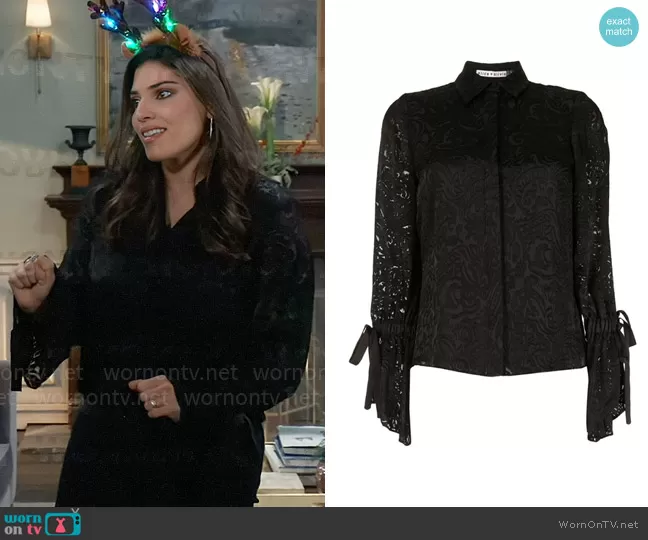 Brook Lynn's fashion choices on GH have always been a topic of interest, and her black patterned tie cuff blouse is no exception. This elegant top, the Willa Burnout Blouse by Alice + Olivia, encapsulates what it means to blend sophistication with trendy details. The blouse features a delicate, subtle lace pattern that exudes a sense of refined grace, a perfect fit for Brook Lynn's character. What sets this piece apart are the flared cuffs with ties, adding a contemporary twist to the classic button-front design. This blouse is not just a piece of clothing; it's a statement of style and personality, reflecting Brook Lynn's strong and independent character. Its repeated appearances on the show highlight its versatility and enduring appeal, proving that a well-designed blouse can become a wardrobe staple that transcends seasons and trends. It's a testament to the power of understated details in creating an outfit that's both memorable and timeless.