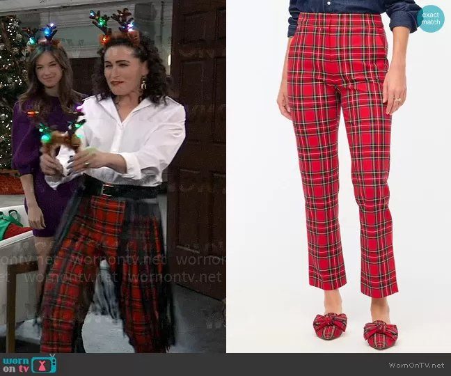Lois Cerullo (played by Rena Sofer) on General Hospital on ABC was spotted wearing this red plaid pants with fringed leather belt on General Hospital on Dec 23 2023's episode. Lois's Pants is the Tartan crop straight pant by J. Crew . Lois's Belt is the Fringed Leather Belt by Zara.