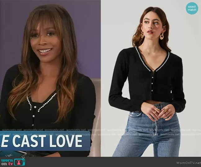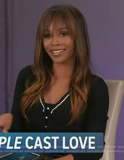 Zuri Hall on Access Hollywood on NBC was spotted wearing this black pearl trim cardigan on Access Hollywood on Dec 26 2023's episode. Zuri's Sweater is the Pearl Embellished Cardigan Sweater by ASTR the Label.