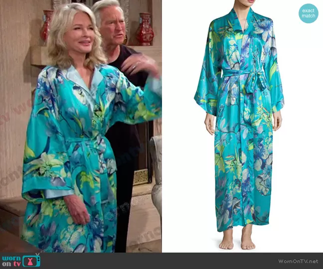 Marlena Evans (played by Deidre Hall) on Days of our Lives on Peacock was spotted wearing this blue floral robe on Days of our Lives on Dec 26 2023's episode. Marlena's Robe is the Capri Floral-Print Long Robe by Christine Lingerie.