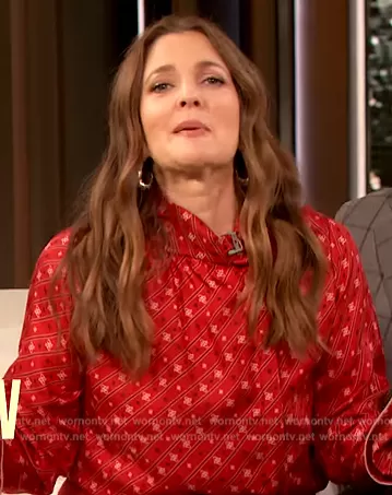 Drew Barrymore on The Drew Barrymore Show on CBS was spotted wearing this red satin printed blouse on The Drew Barrymore Show on Dec 24 2023's episode. Drew's Top is the Foulard Detail Printed Blouse by Fendi.