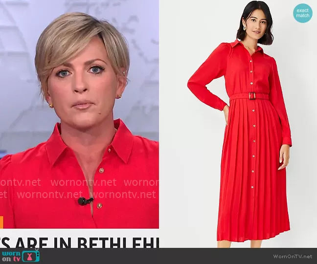 Jamie Yuccas on CBS Mornings on CBS was spotted wearing this Jamie Yuccas’ red shirtdress on CBS Mornings on Dec 26 2023's episode. Jamie's Dress is the Pleated Shirtdress by Ann Taylor .
