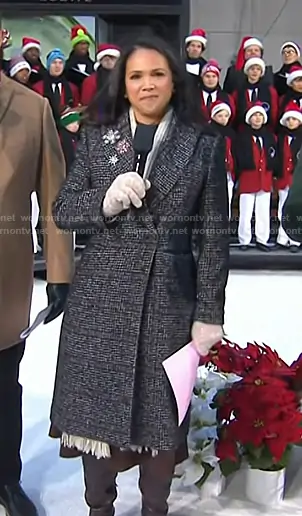 Laura Jarrett on Today on NBC was spotted wearing this black plaid coat on Today on Dec 29 2025's episode. Laura's Coat is the Mirabelle topcoat in Italian textured wool blend by J. Crew.