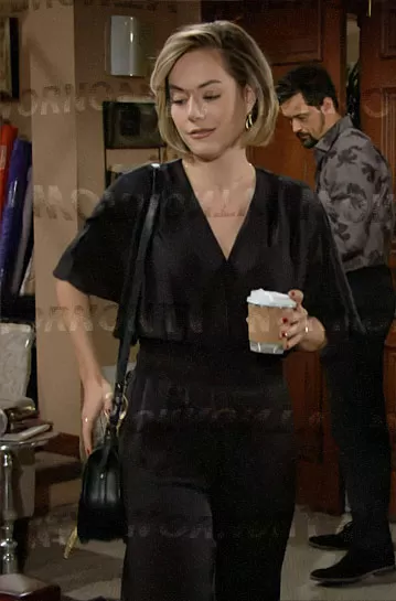 Hope from B&B has once again turned heads with her fashion choice, showing us the power of understated elegance in her latest attire, the Pachela flutter sleeve jumpsuit by Maje. This piece is a quintessential example of how simplicity can be striking. The jumpsuit's unadorned black satin exudes luxury, while the v-neck and short, loose sleeves add a touch of relaxed grace, making it a perfect blend of comfort and sophistication. This ensemble challenges the norm, proving that elegance doesn't have to be complicated. Hope's choice is a reminder that sometimes, less really is more, especially when it's about choosing an outfit that speaks volumes in its subtlety. Her look is not just a style statement but an inspiration for those aiming to achieve a polished yet effortless aesthetic in their everyday wardrobe.