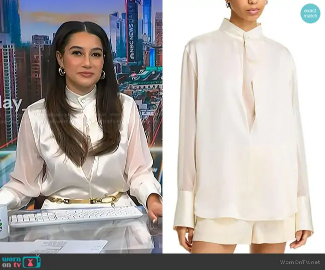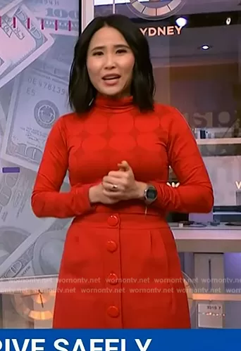 Vicky Nguyen on NBC News Daily on NBC was spotted wearing this Vicki’e red top and skirt on NBC News Daily on Dec 20 2023's episode. Vicky's Top is the Heatteck Extra Warm Turtle Neck Long Sleeve by Uniqlo x Marimekko . Vicky's Skirt is the Faylyn Button Front Skirt by Kate Spade.