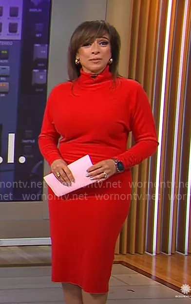 Michelle Miller on CBS Mornings on CBS was spotted wearing this red turtleneck dress on CBS Mornings on Dec 27 2023's episode. Michelle's Dress is the Fallon Dress by Reiss .