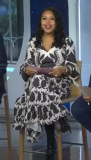 Sheinelle Jones on Today on NBC was spotted wearing this floral print v-neck dress on Today on Jan 15 2024's episode. Sheinelle's Dress is the Leaf Midi Dress by Area Stars.