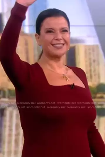 Ana Navarro on The View on ABC was spotted wearing this burgundy dress on The View on Dec 18 2023's episode. Ana's Dress is the Square-Neck Wool Rib-Knit Midi-Dress by Jason Wu.