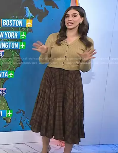 on Today on NBC was spotted wearing this plaid skirt and ribbed cardigan on Today on Jan 01 2024's episode. 's Sweater is the Ribbed Cardigan by Club Monaco . 's Skirt is the Pleated Crepe Recycled Polyester Midi Skirt by Ralph Lauren.