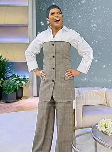 Tamron Hall on Tamron Hall Show on ABC was spotted wearing this gray plaid off shoulder mini dress on Tamron Hall Show on Jan 02 2024's episode. Tamron's Dress is the Prince of Wales wool minidress by Gucci . Tamron's Pants is the Prince of Wales wool pants by Gucci.