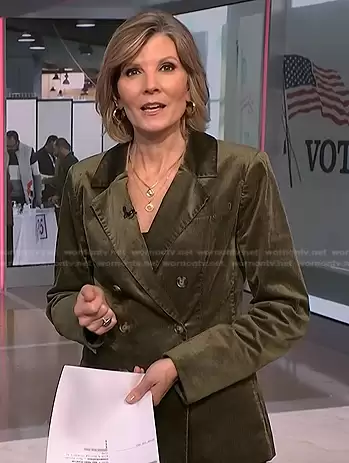 Kate Snow on NBC News Daily on NBC was spotted wearing this green corduroy blazer on NBC News Daily on Jan 02 2024's episode. Kate's Jacket is the Hollie Stretch Corduroy Blazer in Dark Brushed Olive by Paige.