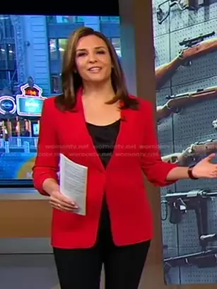 Mary Bruce on Good Morning America on ABC was spotted wearing this red ruched sleeve blazer on Good Morning America on Jan 02 2024's episode. Mary's Jacket is the Khloe Crepe Ruched Blazer by Cinq a Sept.