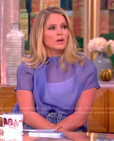 Sara Haines on The View on ABC was spotted wearing this blue mesh gathered top on The View on Jan 02 2024's episode. Sara's Top is the The Kass Top by Khaite.