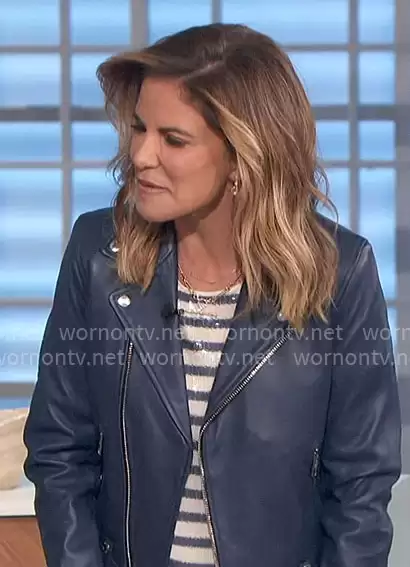 Natalie Morales on The Talk on CBS was spotted wearing this blue sequin stripe top and leather jacket on The Talk on Jan 02 2024's episode. Natalie's Top is the Tchao Sequin Blouse by Zadig & Voltaire . Natalie's Jacket is the Leather Biker Jacket by The Kooples.
