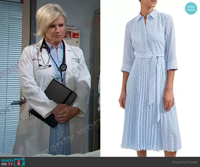 Kayla Brady (played by Mary Beth Evans) on Days of our Lives on Peacock was spotted wearing this blue polka dot dress on Days of our Lives on Jan 03 2024's episode. Kayla's Dress is the Leona Dress in Dusky Blue by Hobbs.