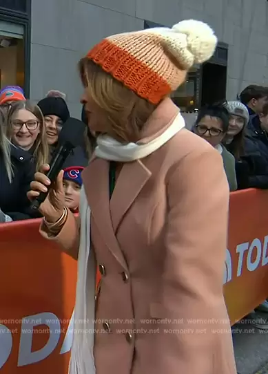 Hoda Kotb on Today on NBC was spotted wearing this pom-pom beanie on Today on Jan 03 2024's episode. Hoda's Beanie is the Colorblock Pommed Beanie by Anthropologie.