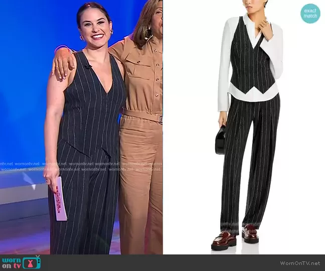 Donna Farizan on Today on NBC was spotted wearing this black pinstripe vest and pants on Today on Apr 22 2024's episode. Donna's Vest is the Simple Pinstripe Vest by Norma Kamali . Donna's Pants is the Pull On Pinstripe Pants by Norma Kamali.