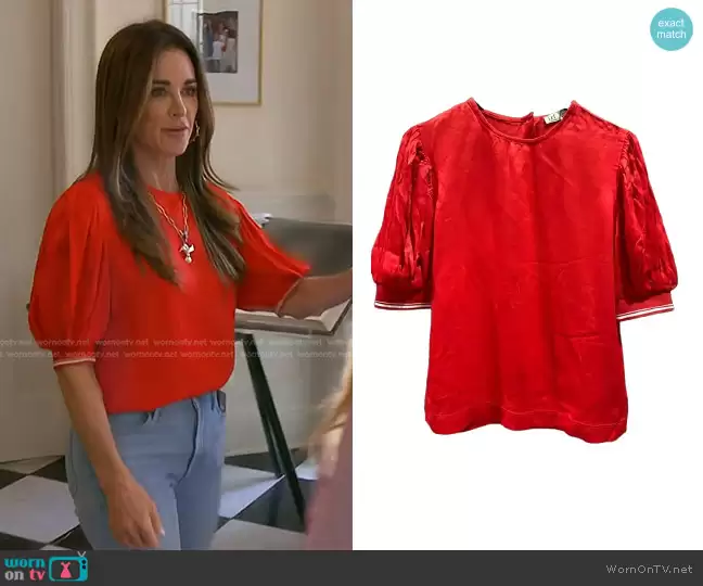 Kyle Richards on The Real Housewives of Beverly Hills on Bravo was spotted wearing this red puff sleeve top on The Real Housewives of Beverly Hills on episode 'Re-Lentless Erika' (13x10) in Jan 2024. Kyle's Top is the Satin Top by Zara trf Collection . Kyle's Pants is the Frayed Ankle Jeans by Mother . Kyle's Shoes is the Lupita Slipper Sandals by Amina Muaddi.