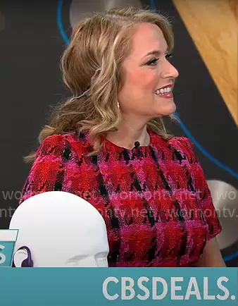 on CBS Mornings on CBS was spotted wearing this red houndstooth dress on CBS Mornings on Jan 04 2024's episode. 's Dress is the Shimmer Houndstooth Tweed Shift Dress by Ann Taylor .