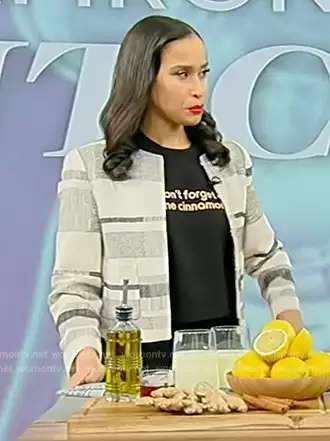 on Tamron Hall Show on ABC was spotted wearing this Jen Jones’ gray stripe jacket on Tamron Hall Show on Jan 05 2024's episode. 's Jacket is the Structured Striped Jacket by Zara.