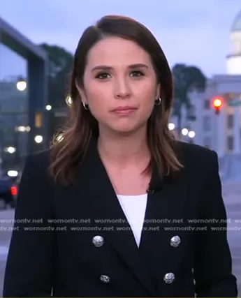 Elizabeth Schulze on Good Morning America on ABC was spotted wearing this black blazer with silver buttons on Good Morning America on Apr 04 2024's episode. Elizabeth's Jacket is the Miller Dickey Jacket by Veronica Beard.
